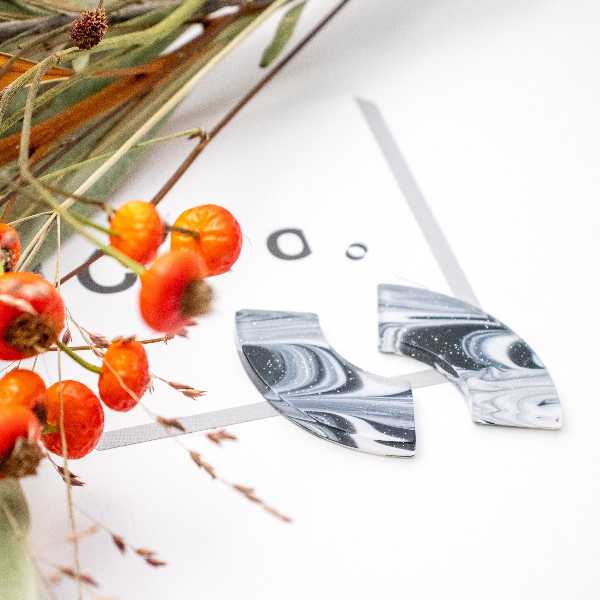 大胆な白黒のマーブルにシルバーのラメが入っています。
