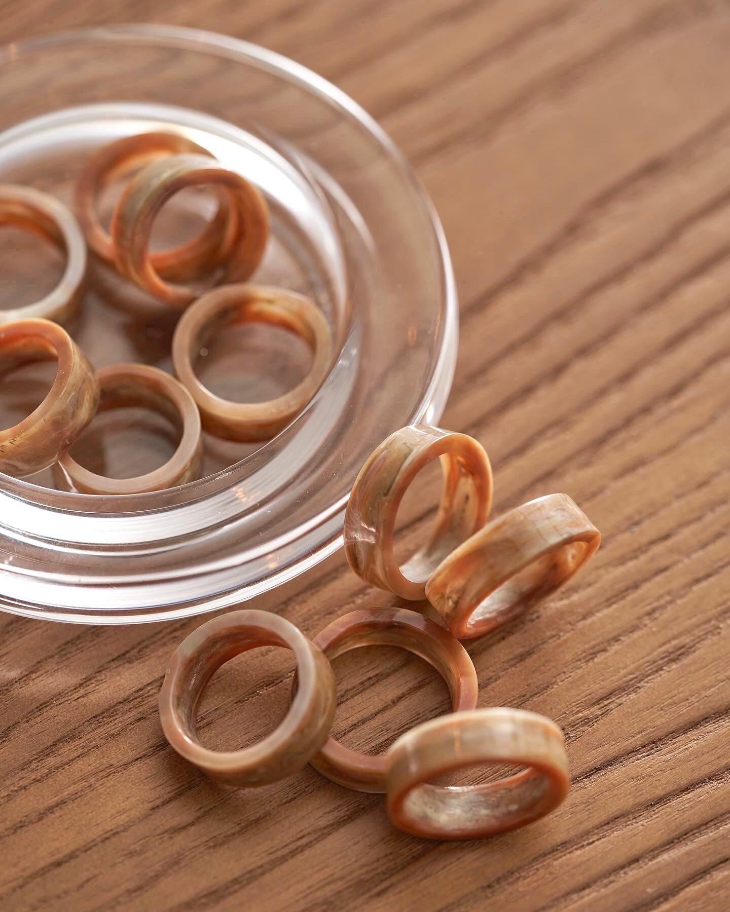 茶色とブルーとホワイトが混じり合い、肌馴染みの良いやさしいアートリングになります。